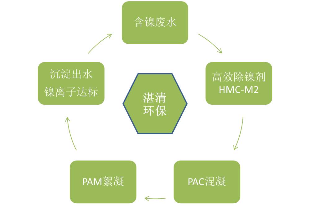 使用湛清環(huán)保的高效除鎳劑HMC-M2處理含鎳廢水時,需要調(diào)節(jié)廢水pH至指定條件下,而后通過螯合反應(yīng),以及PAC混凝,PAM絮凝,把鎳離子去除,具體反應(yīng)流程如下所示: