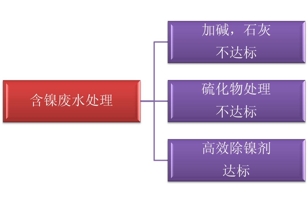 而對于電鍍鎳,采用加堿法或者硫化物處理含鎳廢水,鎳離子基本能夠去除,然而如果廢水中含有絡(luò)合鎳、化學(xué)鎳、鋅鎳合金鍍種時(shí),零部件的清洗廢水中就含有大量的絡(luò)合劑,絡(luò)合劑與鎳離子生成絡(luò)合鎳以后,在加堿的情況下,鎳離子很難與氫氧根結(jié)合生成沉淀。