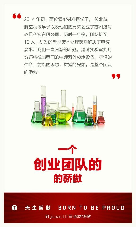 2014年初蘇州湛清環(huán)保科技有限公司在蘇州昆山正式成立。 團(tuán)隊由兩位清華材料系學(xué)子、一位北航航空領(lǐng)域?qū)W子以及其它幾位兄弟組成。湛清實驗室歷時一年多,研發(fā)推出的廢水處理藥劑(重金屬捕集劑、除磷劑)真正解決了國內(nèi)電鍍廠商們的廢水難題,九月份,湛清實驗室又將推出他們的研發(fā)新戰(zhàn)果---紫外電鍍廢水處理設(shè)備,用環(huán)保理念堅持將廢水處理達(dá)標(biāo),讓企業(yè)安全排放。團(tuán)隊成員們均為80、90后,他們擁有年輕的朝氣、前沿的思想、拼搏的兄弟,天生驕傲,是的,BORN TO BE PROND!