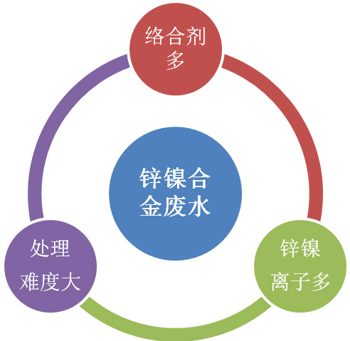 鋅鎳合金是一種抗腐蝕鍍層,具有優(yōu)良的耐蝕性。含鎳13%的鋅鎳合金層比鋅高6-10倍,優(yōu)于鎘和鎘鈦合金,其主要應用于汽車配件。該鍍種產(chǎn)生的鋅鎳廢水中含有大量的高強度絡合劑,廢水成分復雜且處理難度大,傳統(tǒng)的工藝無法將其處理至達標。