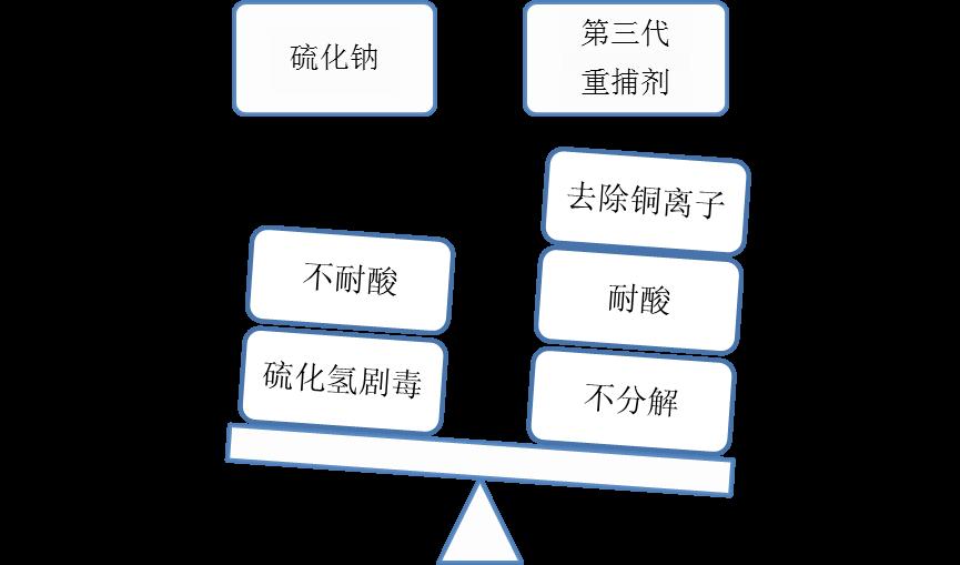相對(duì)于硫化鈉,第三代重捕劑能夠耐酸耐堿,即使在酸性條件2-3條件下,也能夠與銅離子結(jié)合生成沉淀,而且不會(huì)與酸反應(yīng)生成硫化氫,安全環(huán)保。