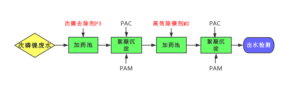 次磷去除劑,是一種多相無(wú)機(jī)復(fù)合鹽,專門針對(duì)電鍍廢水中的次亞磷,采用均相共沉淀技術(shù),次亞磷去除劑能夠直接與之結(jié)合形成沉淀,通過(guò)混凝絮凝,把次亞磷去除達(dá)標(biāo)。