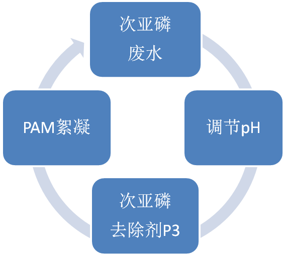 使用次亞磷去除劑處理電鍍次亞磷廢水,與傳統(tǒng)的除磷工藝不同,傳統(tǒng)除磷工藝,需要把廢水pH調(diào)節(jié)至堿性條件下,加入石灰進(jìn)行沉淀處理,其原理是石灰與正磷酸鹽結(jié)合生成沉淀,但是除去次磷酸鹽需要首先把廢水pH調(diào)節(jié)至酸性進(jìn)行處理,次亞磷去除劑在酸性條件下能夠與次磷酸鹽結(jié)合生成沉淀,具體流程如下: