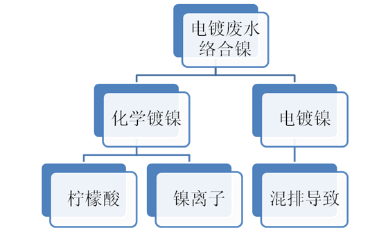 絡合鎳是指鎳離子與絡合劑結合形成的小分子重金屬絡合物,常見的絡合劑有氨水、檸檬酸、蘋果酸、酒石酸、EDTA、氰等有機物。絡合鎳多存在于電鍍廢水、冶煉廢水、洗礦廢水中,由于絡合鎳是通過鎳離子與絡合劑產生的絡合反應形成的,因此十分穩(wěn)定,在廢水處理中,鎳離子很難沉降除去,成為廢水處理中的一大難點。