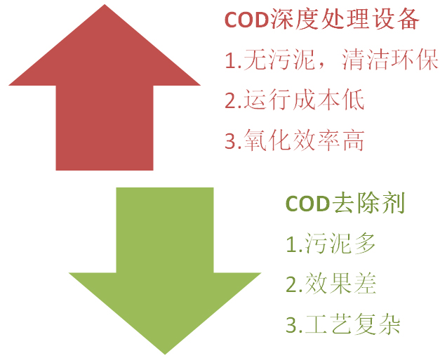 COD去除劑,白色粉末,實(shí)為COD屏蔽劑,在正常pH和室溫下,無法去除廢水中的COD,在消解測定COD時(shí),能夠發(fā)揮氧化作用,氧化COD,因此測定時(shí)無法測定真實(shí)的COD含量。而COD深度處理設(shè)備,電極氧化雙氧水產(chǎn)生強(qiáng)氧化的羥基自由基,對(duì)COD具有強(qiáng)大的氧化作用,去除效率高,可同時(shí)去除氨氮。