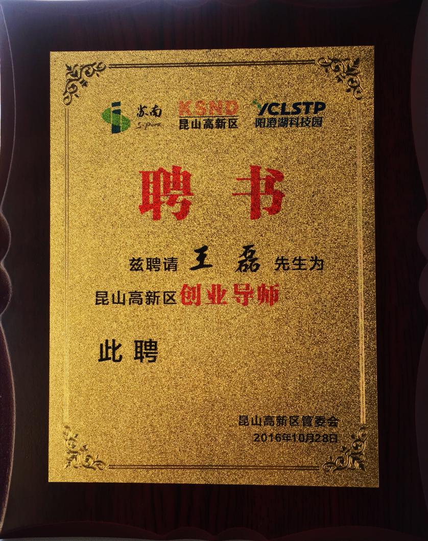 20161028日,創(chuàng)始人王磊出席了“陽澄逐夢·高新綻放”2016昆山高新區(qū)金秋經(jīng)貿(mào)活動暨項目集中簽約揭牌儀式,并被評選為昆山高新區(qū)“創(chuàng)業(yè)導師”。