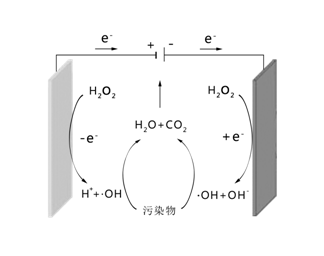 陰極反應(yīng):e-+H2O2→OH-+·OH     陽極反應(yīng):H2O2-e-→H++·OH