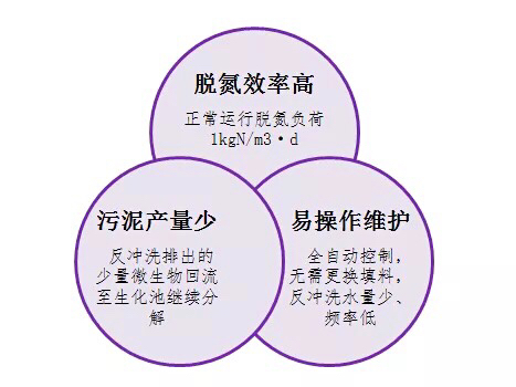 首先,經(jīng)特殊改造后,濾池內部建立了順暢的排氣微孔道,優(yōu)化后的流態(tài)促使生成的氮氣快速被排出,減少了反應器死區(qū)及無效空間,提高了反應器穩(wěn)定性和脫氮效率;其次,改性后的專屬填料具有了更加豐富的微觀孔道結構,使單位體積內的微生物數(shù)量得到大幅提升,同時由于提高了填料表面的親水性,微生物的附著能力隨之提升;最后,由荷蘭引進的反硝化菌屬,經(jīng)馴化之后,對高鹽、高毒、高氮的工業(yè)廢水有極好的耐受性,能在水質波動較大的水體中仍舊保持極強的活性,使反應速率持續(xù)高效。