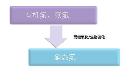 前端轉(zhuǎn)化:即硝態(tài)氮的生成過程。通過化學(xué)高級氧化或生物硝化作用,將有機氮、氨氮分解轉(zhuǎn)化為硝態(tài)氮。