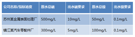兩家廠商分別經(jīng)過三個(gè)月的技術(shù)考察并陸續(xù)確認(rèn)合作。其廢水鎳磷等污染物指標(biāo)和設(shè)計(jì)參數(shù)如下表所示: