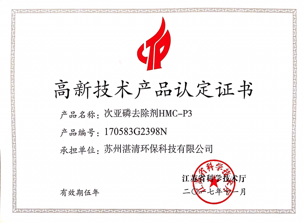 次亞磷均相共沉淀技術(shù):次亞磷去除劑HMC-P3是湛清環(huán)保研發(fā)人員針對(duì)次亞磷酸鹽廢水開發(fā)的除磷藥劑,發(fā)明專利公開號(hào)CN104891632B,并榮獲“江蘇省高新技術(shù)產(chǎn)品”稱號(hào)。