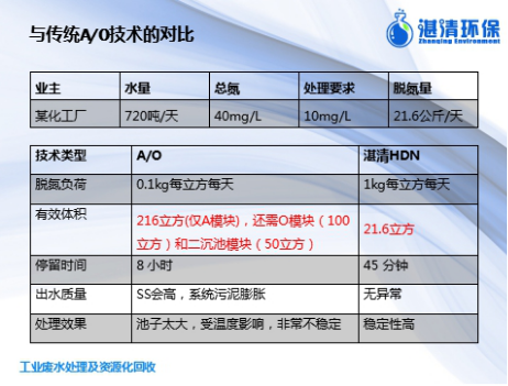 湛清HDN工藝為傳統(tǒng)工藝的升級工藝,從脫氮效率到占地面積,再從操作維護到后續(xù)處理均進行了改革及突破。HDN工藝實現(xiàn)了對傳統(tǒng)脫氮效率的10倍提升,即:1.0kgN/m3.d,而占地面積僅需8m2,無需設置二沉池等配套裝置,污泥產量大幅減少,同時實現(xiàn)了自動控制,節(jié)省了人力成本,并使運行成本可以控制在1元/噸水以下,在總氮排放標準迅速提高的一年內解決了很多老廠改造及園區(qū)新建工程的工藝缺陷,在多種廢水處理中實現(xiàn)了應用。