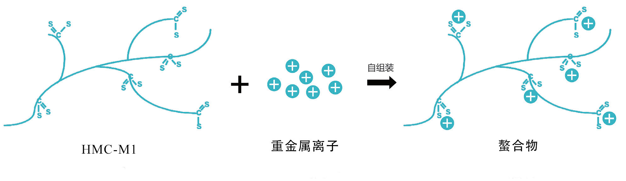 重捕劑M1在微觀狀態(tài)下是一種多交聯(lián)高分子有機化合物,在溶液中能夠與銅、鎳、鋅以及三價鉻等重金屬離子形成螯合鍵,通過聚合氯化鋁混凝,聚丙乙烯酰胺絮凝形成不溶性沉淀,把重金屬去除。