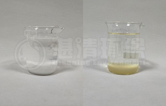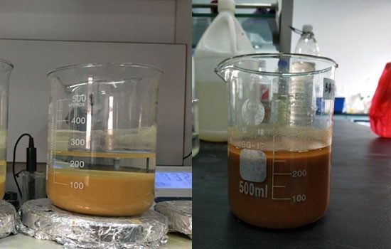左為總磷濃度20倍投加量,右圖為總磷濃度40倍投加量。由此可以看出,除磷效果與次亞磷去除劑的投加量并不存在正比關(guān)系。并且隨著投加量的提升,污泥量增多,上清液略顯黃色。