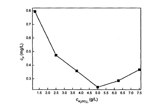 何為間接法,即先通過高級氧化將有機磷氧化為無機磷再處理,這里不多贅述。我們將側重點放在直接法中有機磷如何處理的問題上。如果嘗試在有機磷廢水中直接投加硫酸鋁等混凝劑。根據(jù)實驗,得出一條投加量與處理效果的曲線??梢钥闯霎斄蛩徜X投加量達到一定量時,總磷濃度可以達到0.5ppm,一級A標準。