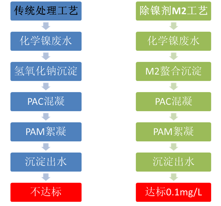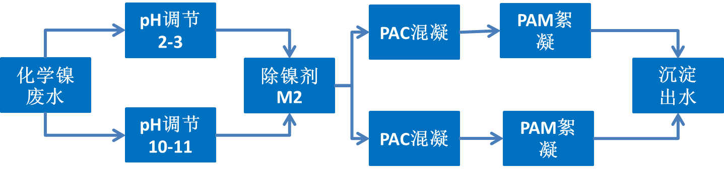 傳統(tǒng)去除化學(xué)鎳的方法無法處理達標,采用除鎳劑M2處理可以實現(xiàn)達標排放。在使用氫氧化鈉沉淀處理的工藝中,使用M2進行螯合沉淀,取代氫氧化鈉沉淀法,再通過PAC混凝,PAM絮凝,沉淀出水即可。電鍍液不同,M2的使用pH也不同,一般在2-12之間范圍內(nèi)均可以使用。