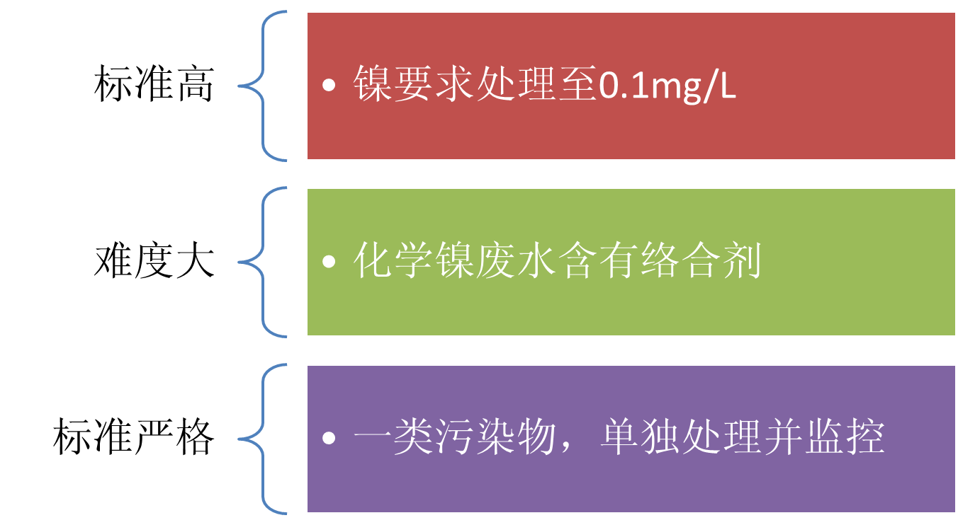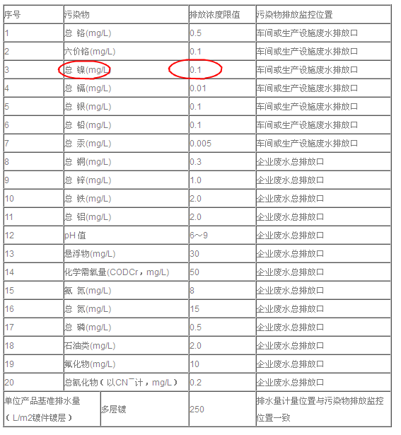 在電鍍廢水排放標(biāo)準(zhǔn)中,表三標(biāo)準(zhǔn)要求鎳排放濃度不高于0.1mg/L,由于化學(xué)鎳廢水的難處理,實(shí)現(xiàn)0.1的難度很大,廣東地區(qū)一度要求鎳需要處理至表三標(biāo)準(zhǔn),后來因?yàn)楸容^難執(zhí)行,而把標(biāo)準(zhǔn)又降低到了0.5mg/L,因此廣東地區(qū)的排放標(biāo)準(zhǔn)被稱為表2.5,但是隨著環(huán)保力度越來越大,鎳的排放標(biāo)準(zhǔn)會(huì)很快提到表三標(biāo)準(zhǔn),因此相關(guān)電鍍廠需要提前確認(rèn)處理工藝,以免措手不及。