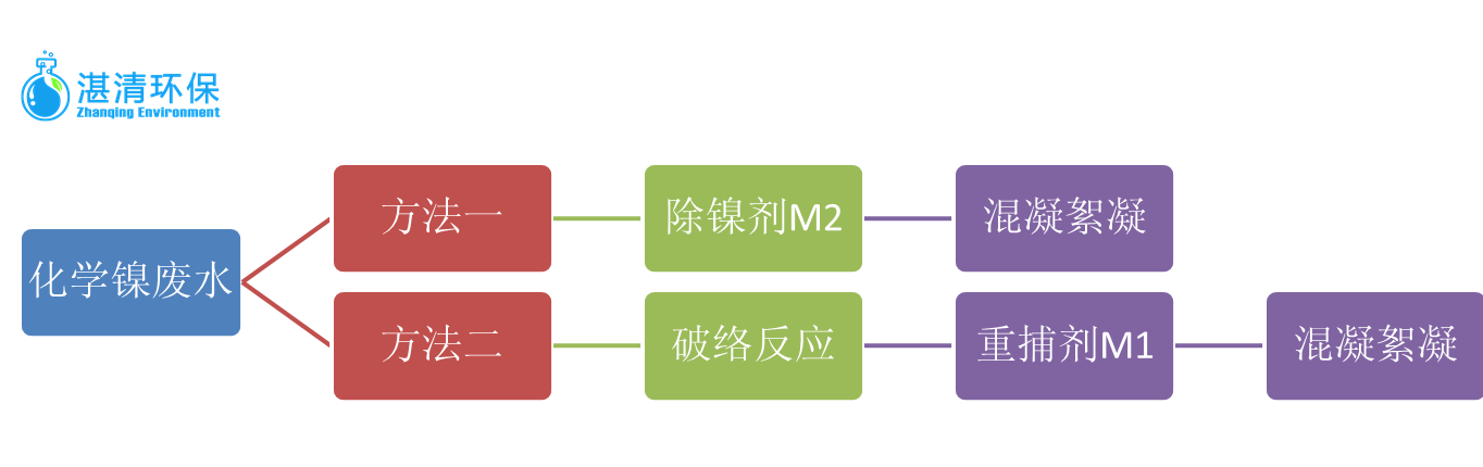 化學(xué)鎳的化學(xué)法處理辦法一般有兩種,一種是使用除鎳劑M2直接螯合處理,除鎳劑本身含有大量的除鎳基團(tuán),除鎳基團(tuán)通過螯合作用能夠把絡(luò)合鎳破壞掉,進(jìn)而沉淀除去,一般的用量為鎳離子濃度的10-15倍。另外一種辦法是通過破絡(luò)作用將絡(luò)合劑與鎳離子之間的結(jié)合鍵破壞,而后通過重捕劑M1進(jìn)行捕捉,把破壞以后的鎳離子除去,一般用量為鎳離子的5-10倍。