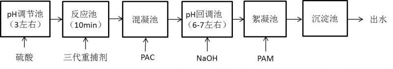 調(diào)節(jié)廢水pH至酸性,加入第三代重金屬捕捉劑M1進(jìn)行沉淀,把重金屬全部去除,工藝流程如下: