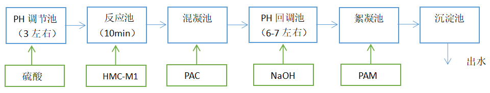 通過(guò)進(jìn)行各項(xiàng)實(shí)驗(yàn),發(fā)現(xiàn),調(diào)節(jié)廢水pH至酸性,加入重金屬捕集劑M1進(jìn)行沉淀,把重金屬全部去除,工藝流程如下: